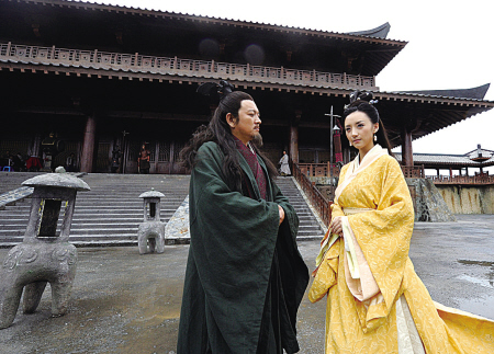 图:近日开拍的数字电影《西施》,由王永强扮演的勾践和李晞媛扮演的西施在片场。(杨忠华 严 龙 摄)