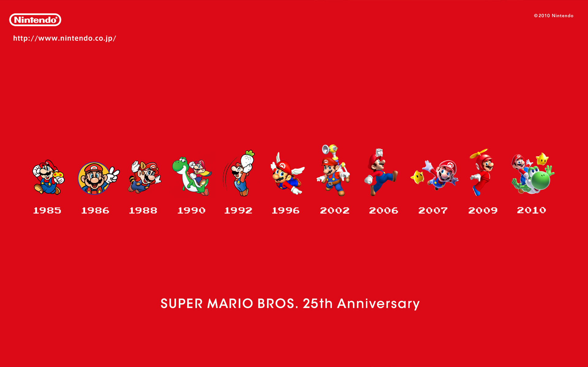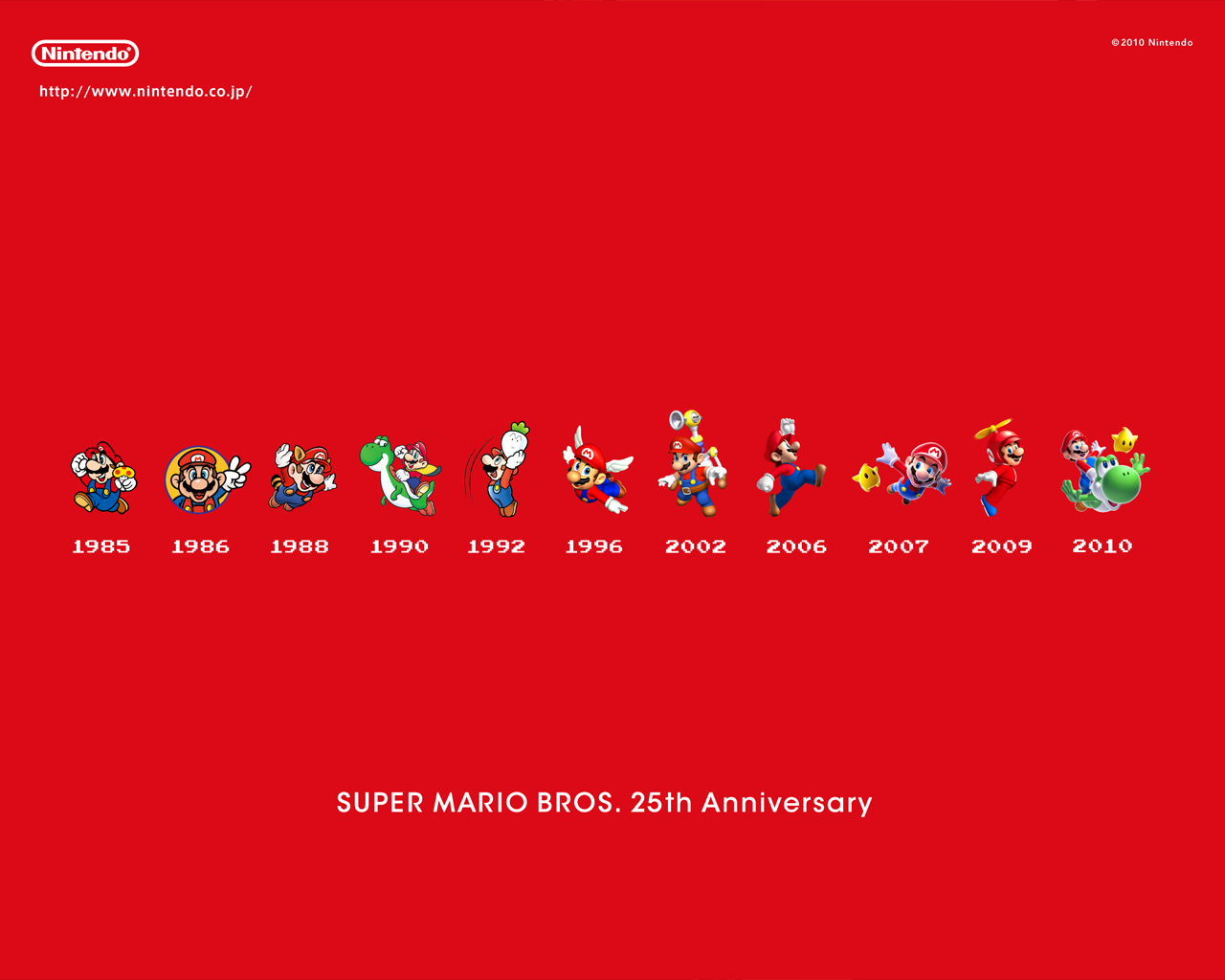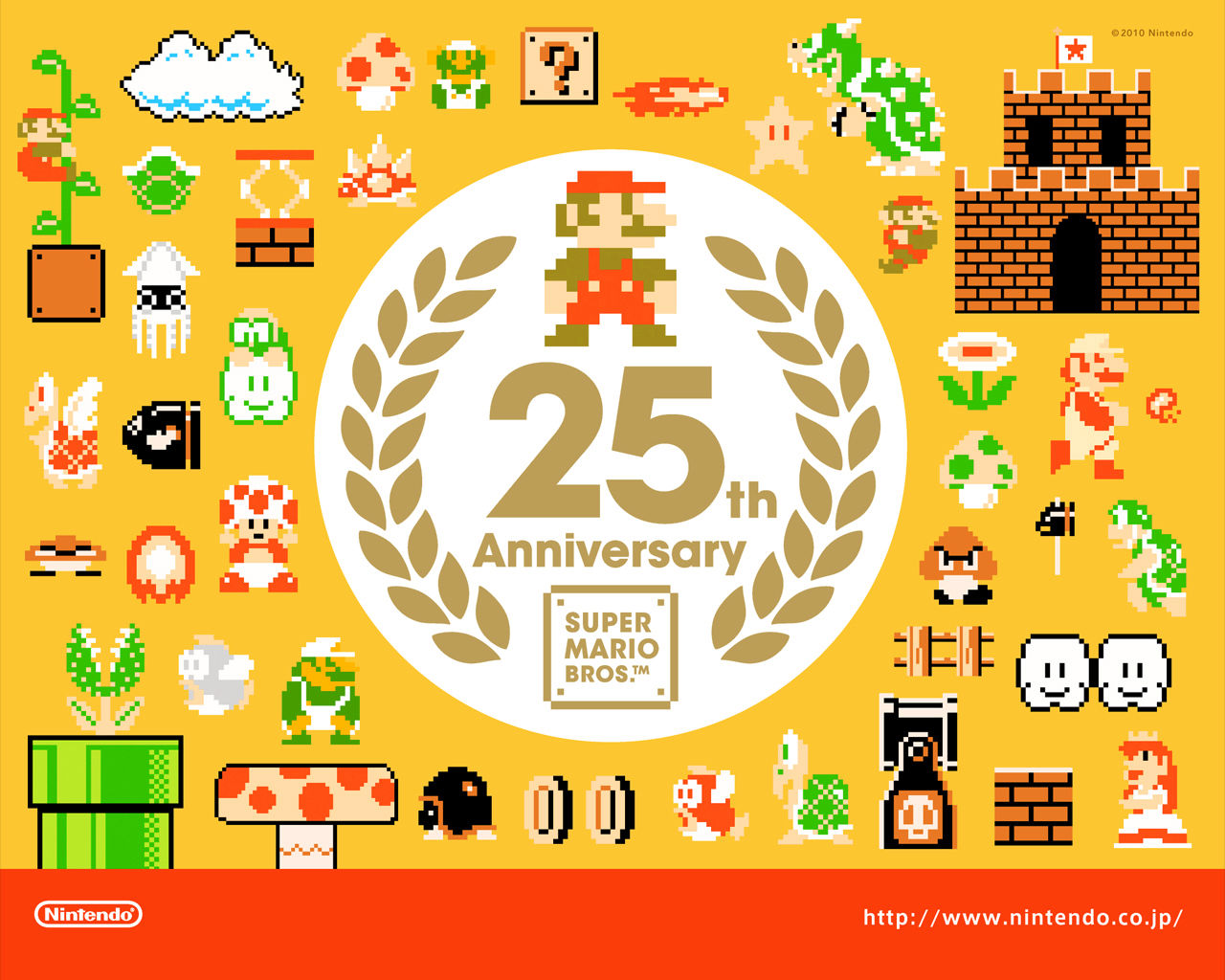 今年是马里奥系列诞生25周年的日子,任天堂官方陆续推出了许多纪念活动来庆祝这一个特殊的日子,这次为大家带来的就是25周年的纪念壁纸,官方一共放出六款,每一款有六种分辨率供玩家们选择,玩家们在图片上右键即可另存图片,这一套壁纸是否让你回忆起了童年呢?不用犹豫了,猛击你的鼠标收藏吧!