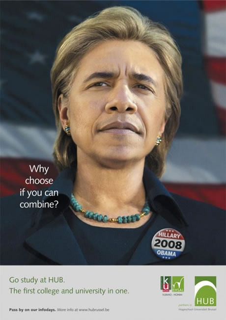如果希拉里和奥巴马能够合为一体,支持民主党美国选民就不用考虑把选票投给谁了。超级大国的影响力忒大了,于是就有人来个顺手抄刀,拿这两个现在热遍全球的人做起了招生广告。