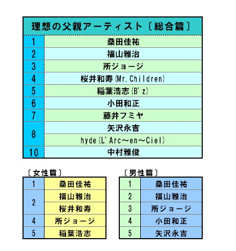 今周末15日(日)は父の日。やっぱり自分の父亲が1番だけど、実は理想とちょっと违うという人もいるのでは? そこでオリコンでは『父亲にしたいと思うアーティスト』を调査?#65310;t合1位は、今年5月に无期限活动休止を宣言したサザンオールスターズの【桑田佳佑】、2位には、昨年人気を博した主演ドラマ『ガリレオ』(フジテレビ系)の映画化も话题の【福山雅治】がそれぞれ“2年连続”で辉き、3位には昨年6位からの上升をみせた【所ジョージ】が选ばれた。