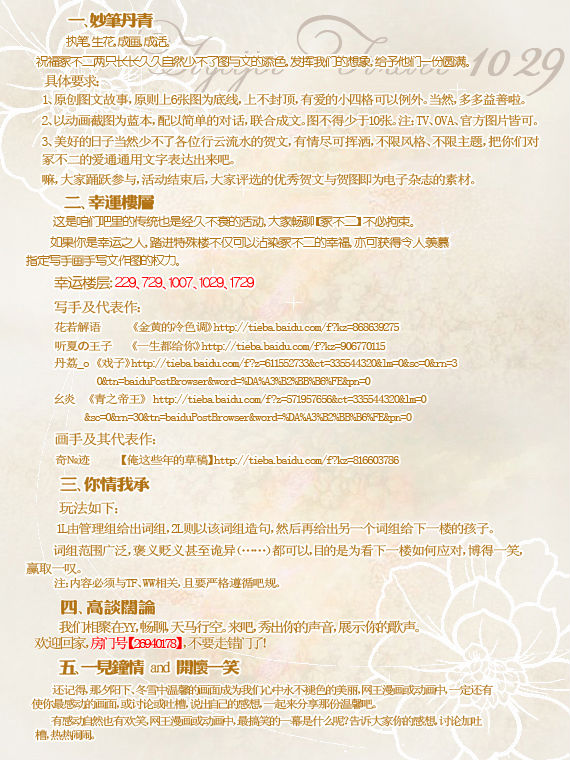 3、美好的日子当然少不了各位行云流水的贺文,有情尽可挥洒,不限风格、不限主题,把你们对冢不二的爱通通用文字表达出来吧。