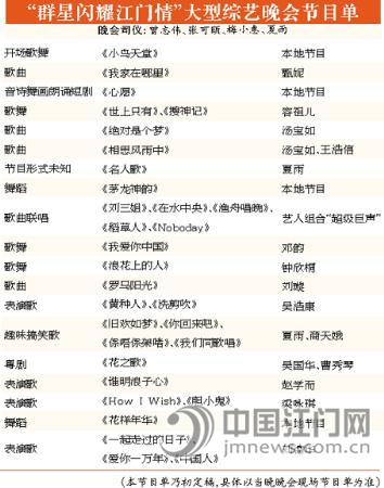 11月6日晚的“群星闪耀江门情”大型综艺晚会,将有哪些明星前来助阵?嘉年华组委会昨天(10月27日)透露,晚会节目现已基本确定:有“乐坛巨肺”之称的甄妮,将以歌曲《我家在哪里》为晚会拉开序幕;而刘德华、容祖儿、阿娇、梁咏琪、黄家强等重磅巨星,也将登台为家乡的父老乡亲献唱,其中刘德华更是以天皇巨星的身份压轴出场,届时将带来包括《一起走过的日子》、《爱你一万年》和《中国人》三首经典老歌。