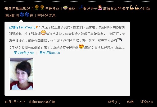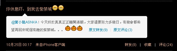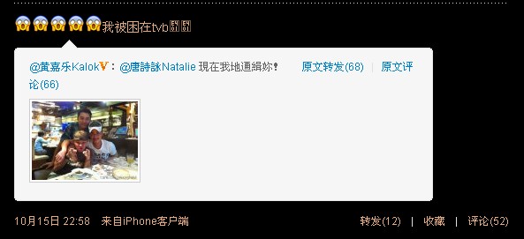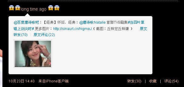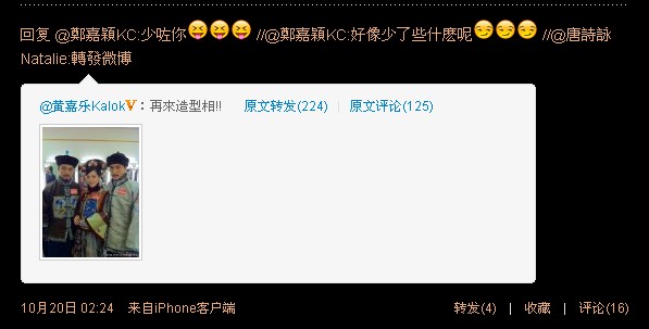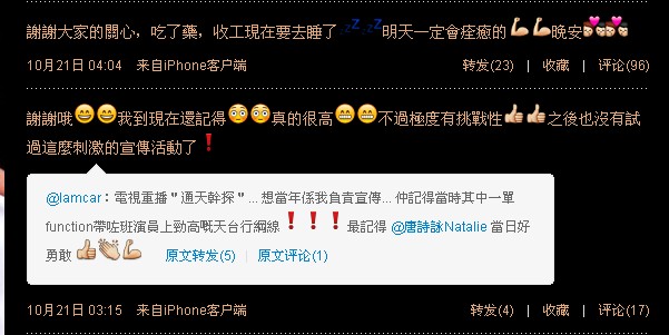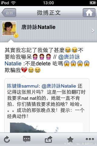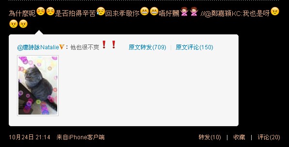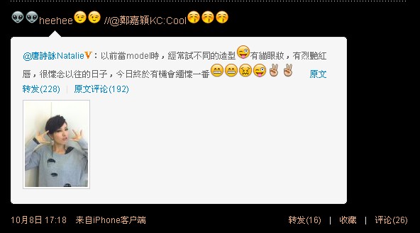 因为小nat一般是用iphone发微博,她发的iphone里的表情我们用电脑是显示不出来的,例如下面这个诗咏回复苗苗的微博,我们用电脑看是看不到表情,但其实小nat是有用表情的,有表情的看起来可爱太多了吧!