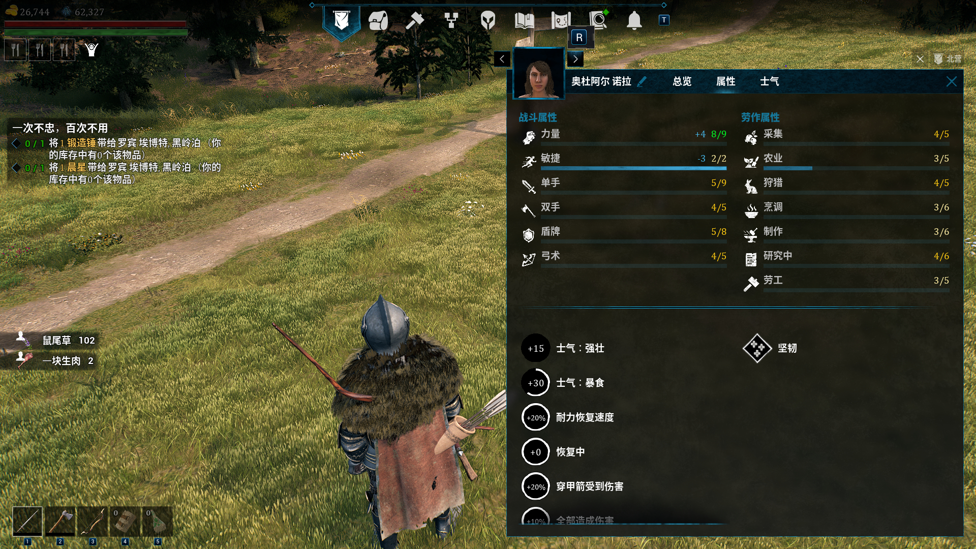力量6拿最强盾的门槛,力量8穿最强甲的门槛,弓箭手用处不大。敏捷5是移速的门槛,低于5的都是老大爷散步,长途行军更是会脱离队伍。