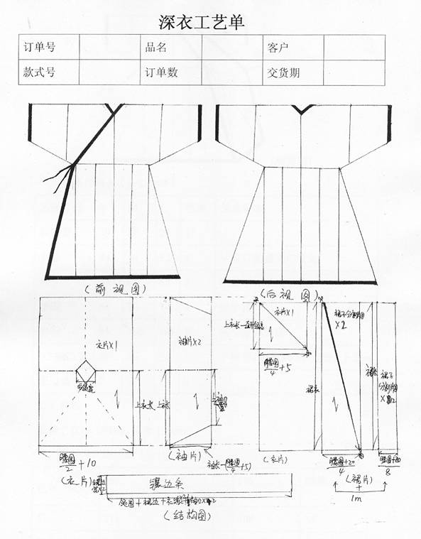 前两天老师布置我们做一份工艺单,于是我就灵感大发,写了份深衣工艺单!因为老师知道我研究古代服饰,也很支持我,所以我上交这份工艺单时,老师也只是简单的说了两个字:“可以!”啊,很高兴的说,至少没被他批回来~~~