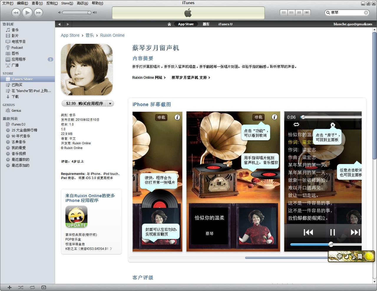 可以在apple store买蔡琴的单曲啦?!?!?!?!?!