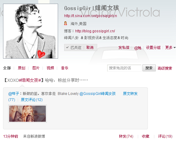在围脖上分享签名顺便加了一下一下@GossipGirl绯闻女孩 看能不能被注意到= =