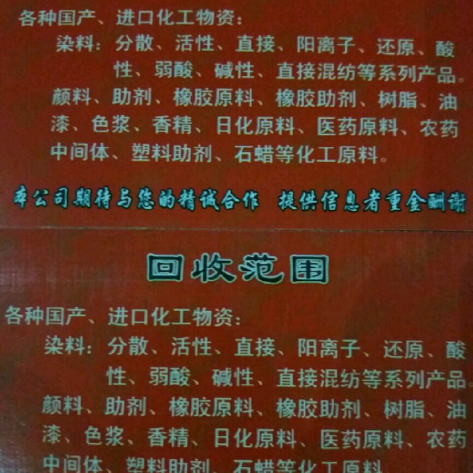 本公司全国上门高价大量回收染料,化工原料,颜料,染料,专业收购印染厂,染整厂,印花厂,油漆厂,化工厂,油墨厂,电缆厂,日化厂,橡胶厂等的库存化工原料,染料,分散染料,酸性染料,活性染料,直接染料,阳离子染料,还原染料,等等,颜料,铁红,铁黄,永固黄,永固紫,酞青蓝,酞青绿,乳液,松香,聚乙二醇,十六醇,十八醇,十六十八醇,脂肪醇,柠檬酸,钛白粉,吐温80,聚维酮k30等,化工原料,油漆涂料,涂料助剂,胶印油墨,化工助剂,橡胶助剂,橡胶原料,塑料助剂,塑料颗粒,塑胶原料,日化原料,聚乙烯醇,纤维素,白炭黑,铂铑热电偶等,食品添加剂的等等上千种化工原料,各种沥青,库存积压,过期,受潮,倒闭搬迁剩余的都可以回收,拥有正规回收资质,诚信第一,价格高,中介有酬,合作热线