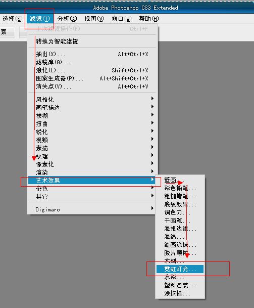 然后选择:滤镜——艺术效果——霓虹灯光,