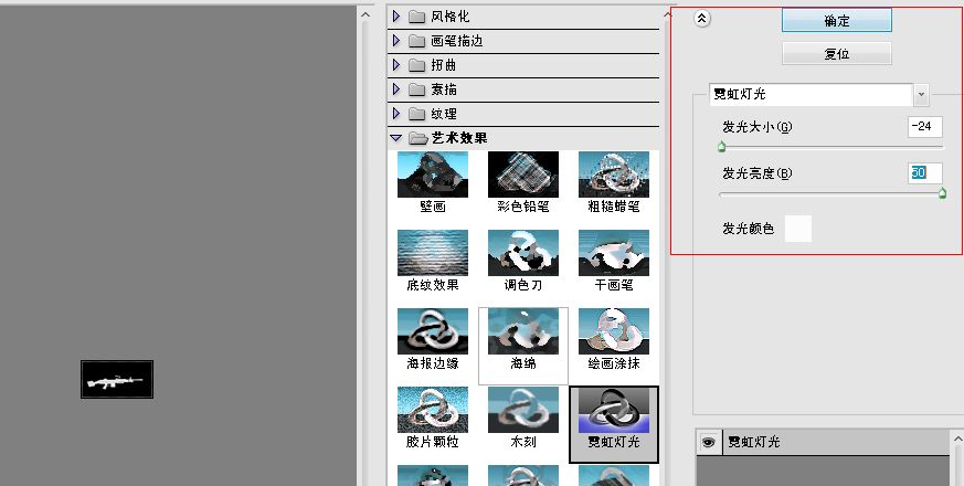 滤镜——艺术效果——霓虹灯光,这次发光大小拉到最小,发光亮度拉到最大,可以看到效果: