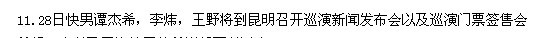 11.28日快男谭杰希,李炜,王野将到昆明召开巡演新闻发布会以及巡演门票签售会