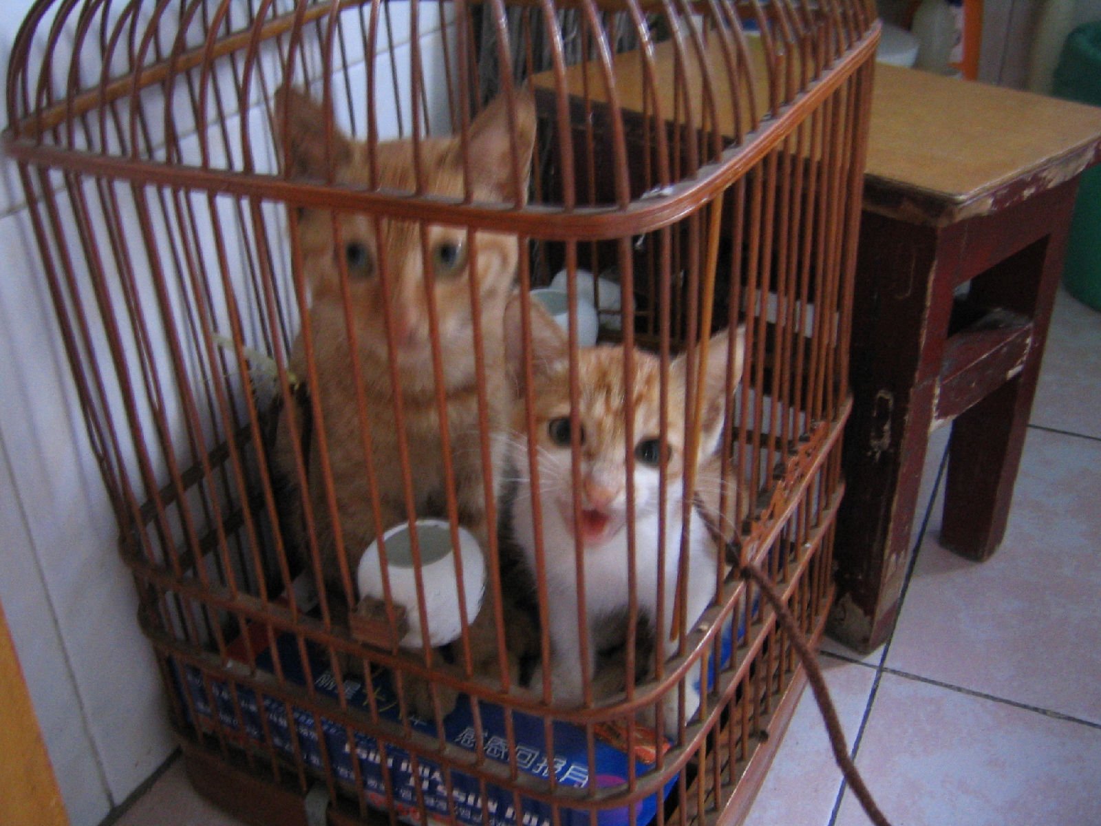 小东西还挺凶,抓它的时候手指被它要出血了。把它塞进鸟笼,它就没辙了,哈哈!我骑上自行车,后面带着鸟笼,里面有一只小猫,我们回家喽!