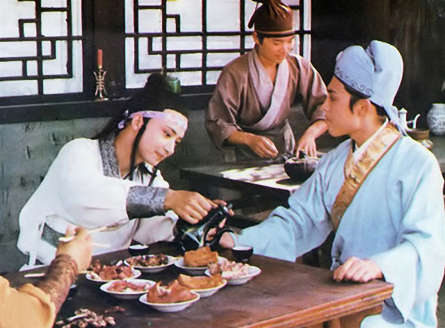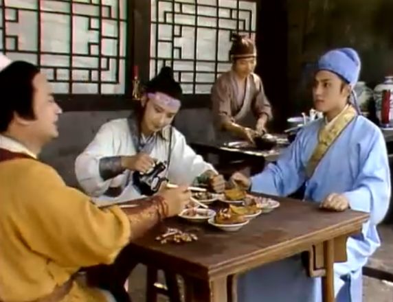 老版的表演非常禁得起推敲。柳湘莲和薛蟠都把贾琏叫“琏二哥”,可想而知贾琏在他们三人当中是最大的了。其次就是薛蟠,最小的是柳湘莲。柳湘莲倒酒的顺序就是先贾琏,后薛蟠。最后是自己。表演非常细腻