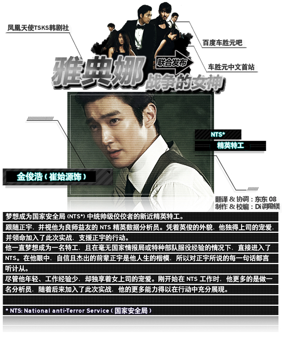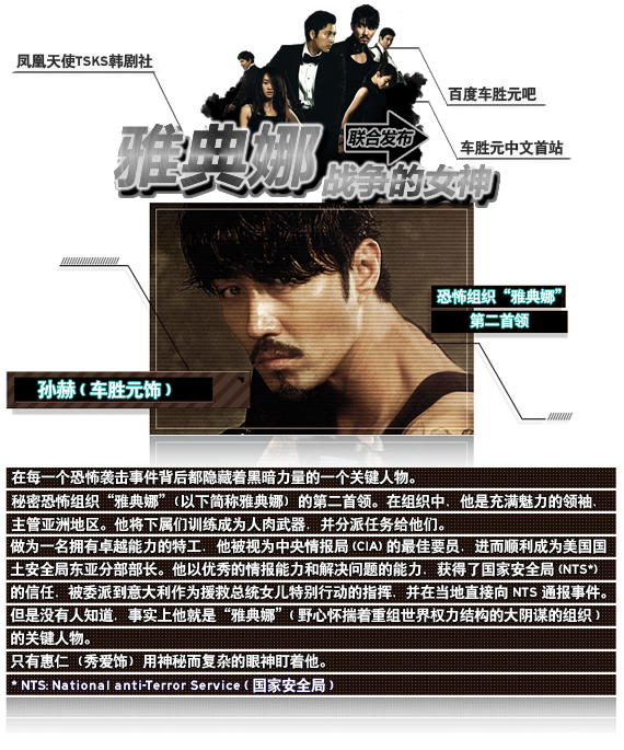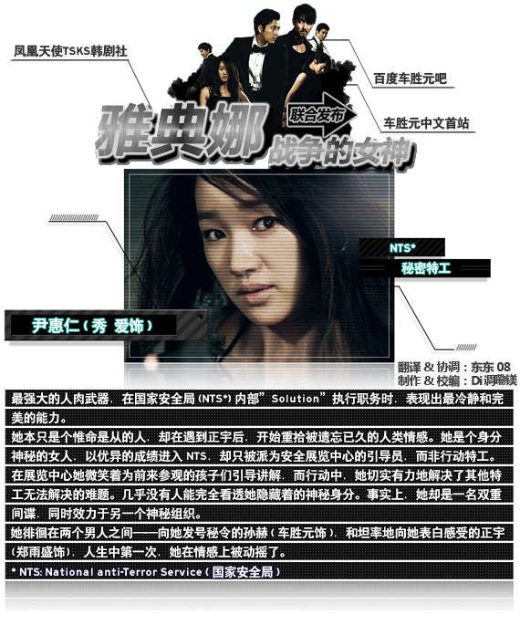 2010年12月,电视剧场年底大戏即将上演!《Iris》外篇——《雅典娜:战争的女神》重磅上线!国安保卫者与高科技反动组织的精彩对决。车胜元挑战黑天使角色,神秘组织“雅典娜”头目惊艳上阵!企图重组世界权力结构的密谋颠覆之战,敌我难分的混沌之争,让车胜元为你的2010韩剧收视送上最精彩的大礼!