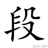 【辰集下】【殳字部】段 ·康熙笔画:9 ·部外笔画:5 〔古文〕《唐韵》《集韵》《韵会》徒玩切《正韵》杜玩切,$音缎。 《说文》椎物也。一曰分段也。帛二曰緉,分而未丽曰匹,旣丽曰段。 《张衡诗》美人赠我锦绣段。 又款段,马名。 《后汉·马援传》御款段。 《注》款,犹缓也,言形段缓也。 《通典》秦州上邽县有段谷水,姜维为邓艾破於此。 《水经注》藉水又东合段溪水,出西南马门溪,东北流。 又阿段,蛮獠之称。 《北史·蛮獠传》獠无名字,以长幼次第呼之,丈夫称阿謩、阿段。 《风俗通》段干木之后,有出辽西者,本鲜䰞檀石槐之后。又段干,复姓。 又卵不成也。与毈通。 《管子·五行篇》羽卵者不段。 《集韵》《韵会》《正韵》$都玩切。同锻。鍊也。一曰小冶也。 《周礼·冬官考工记》段氏为鏄器。 《礼·昏义》妇执笲、枣、栗、段、修以见。段,丁乱反。 从殳,专省声。与叚别。叚乃假借之义,古马切。俗通用,非是。