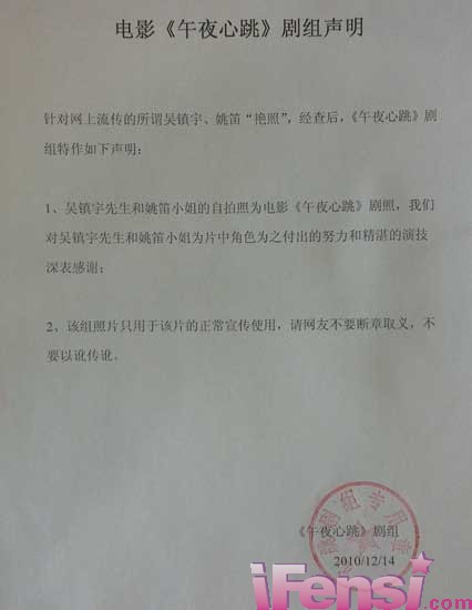 【笛☆love】吴镇宇姚笛"床照"为剧照 剧组发表澄清声明
