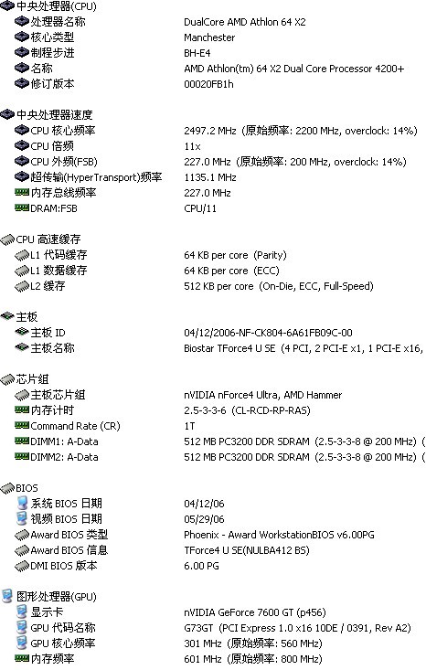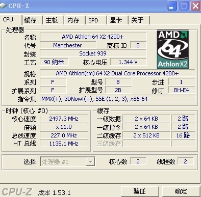 处理器:AMD Athlon64*2 4200+ E4 OC2.5G(227*11)