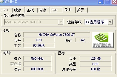显卡:影驰 GeForce 7600 GE 128 MB (高频版7600gs刷成gt)560MHz/1600 MHz