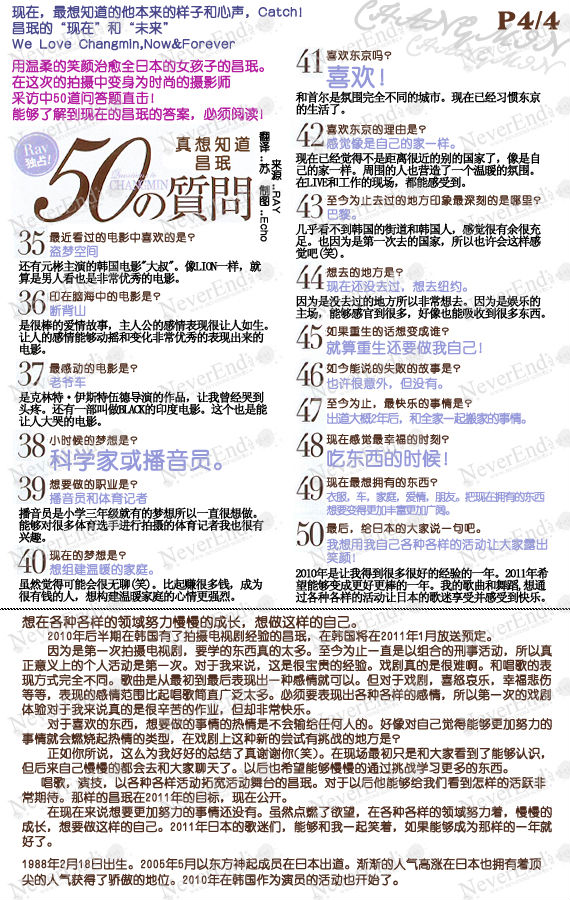 唱歌,演技,以各种各样活动拓宽活动舞台的昌珉。对于以后他能够给我们看到怎样的活跃非常期待。那样的昌珉在2011年的目标,现在公开。