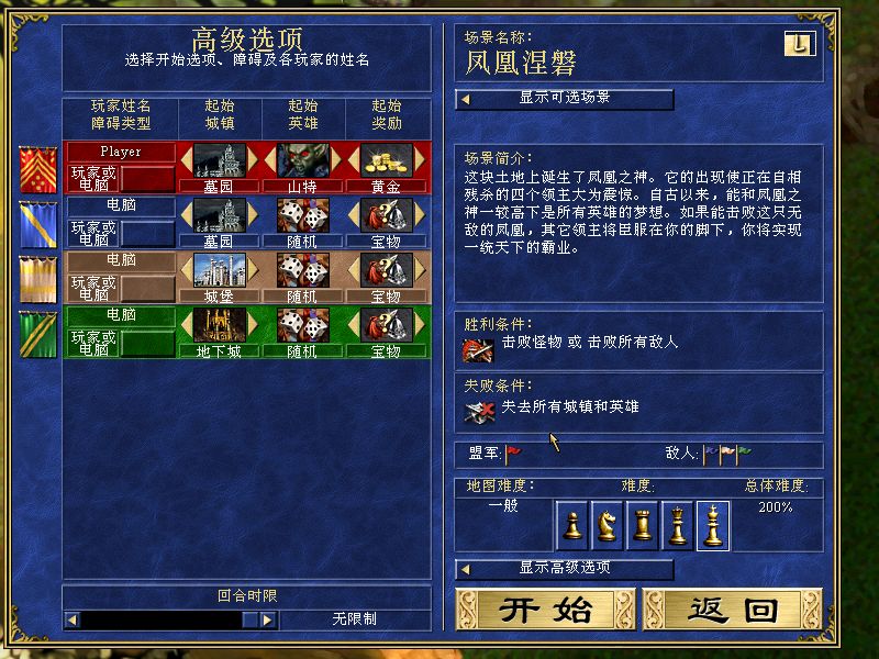 喜欢用山特带cc的打法,简单。选了两个鬼族这样才能用cc打法,反正电脑不缺钱,初期就给他们选了宝物,打法先灭蓝色,再攻其他两家,城堡和地下刚好是正邪两方最强的就选他们了。