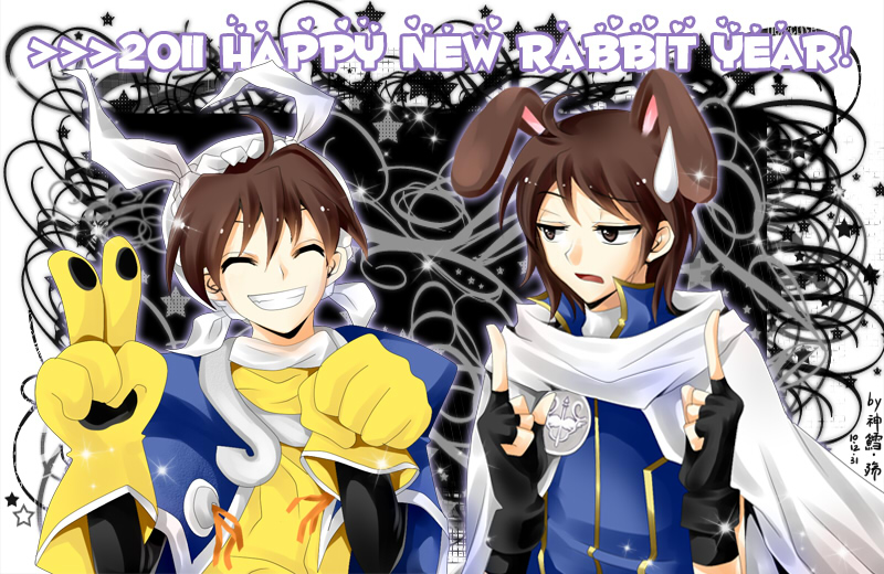 于是是元旦贺图,minna happy new year w~因为是兔年所以画了兔耳版的本命第二位的莱纳w然后因为私心一起画了本命第一位的小望(我其实很想好好吐槽一下自己本命小望了多少年了为毛这是我第一次画小望啊!OTLLLLL好吧其实因为怕画崩毁角色所以一直没画过。。。OTL果、果然最后还是被我毁了OTL