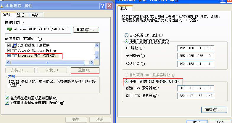 3.点击 “Internet 协议 (TCP/IP)” 继续点“属性”