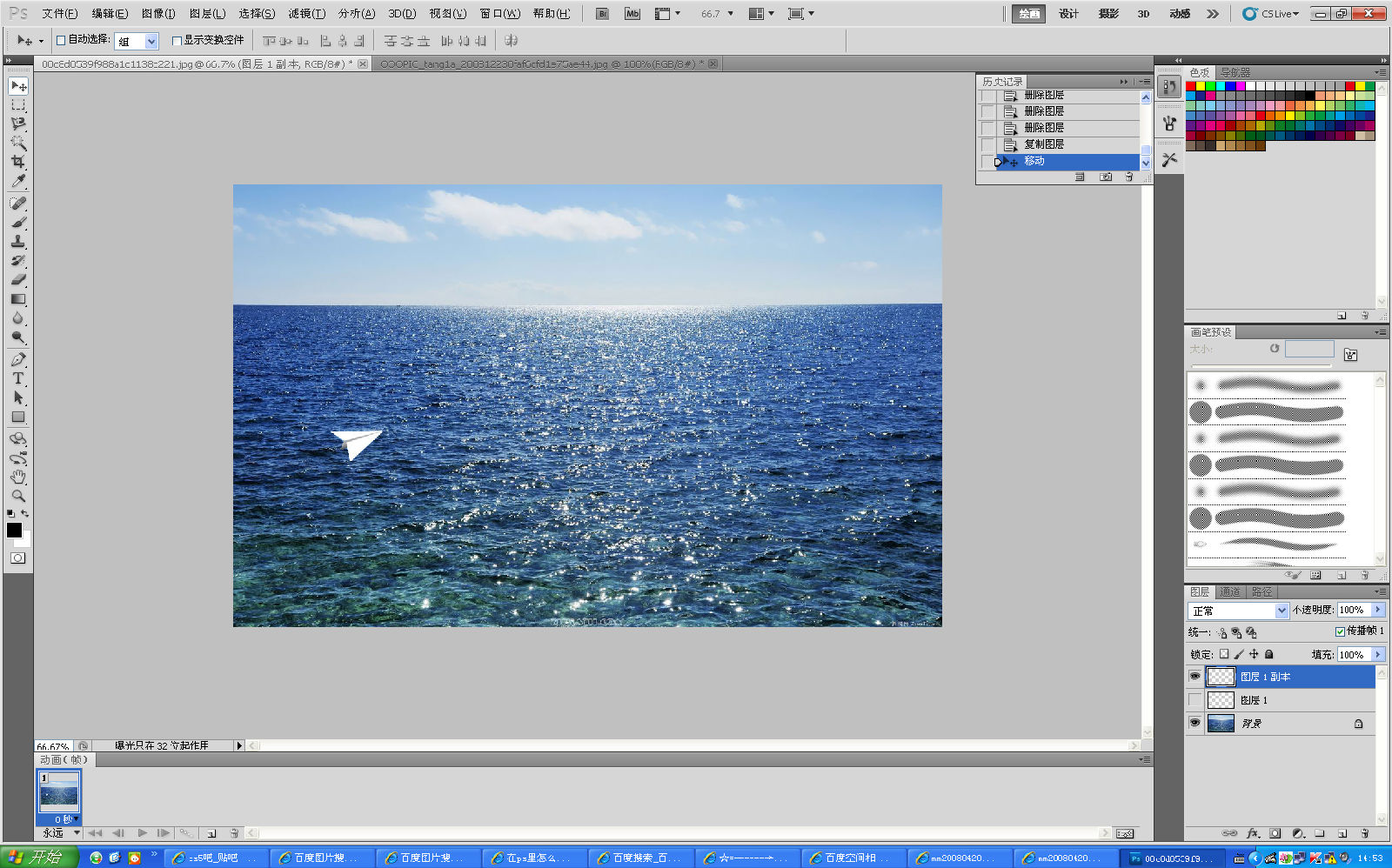 复制图层1 再把图层1的眼睛点掉 把飞机向前拖一点