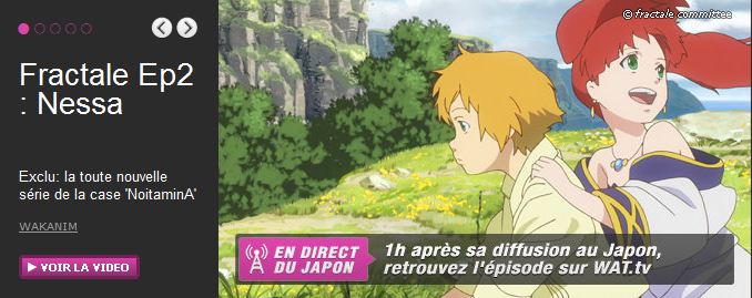 The French video streaming sites wat.tv and wakanim.tv are both now streaming the second episode of Fractale as part of their ongoing simulcast deal for the series. The episodes are region-locked.On Wednesday, the copyright holders in the Fractale Production Committee halted the North American simulcast of Fractale after one episode and requested that licensee Funimation eliminate unauthorized copies of the series from the Internet before the simulcast may continue. As of Thursday evening, Funimation is still streaming the first episode of the series.